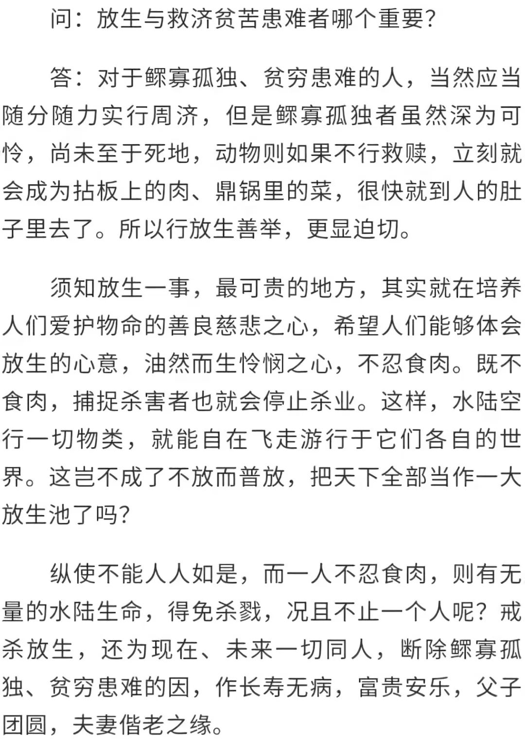佛经中说人天七德:“种姓高贵、形色端严、长寿、无病、缘分优异、财势富足和智慧广大。”其中长寿和无病的根本因即是放生,放生也是其余五德之助缘。我们若能时时以慈心推及物类,自己做到戒杀放生,又广劝他人戒杀放生,则一切事必能吉祥如意,正如《太上感应篇》所说的“吉神佑之,福禄随之。”
