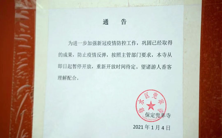 保定兜率寺在山门张贴暂停开放通告和防疫宣传条幅