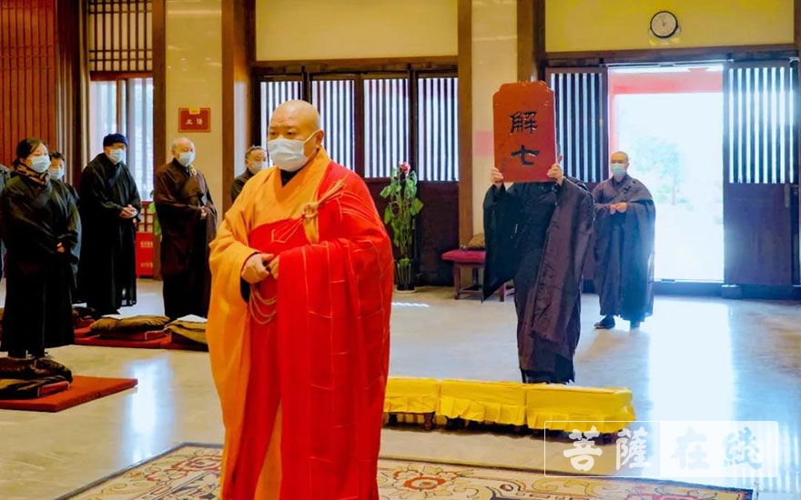 1月13日5时,寒山寺常住法师及寒山学院学僧齐集和合精舍,法师拈香礼佛。高举起七牌,精进佛七正式开始。