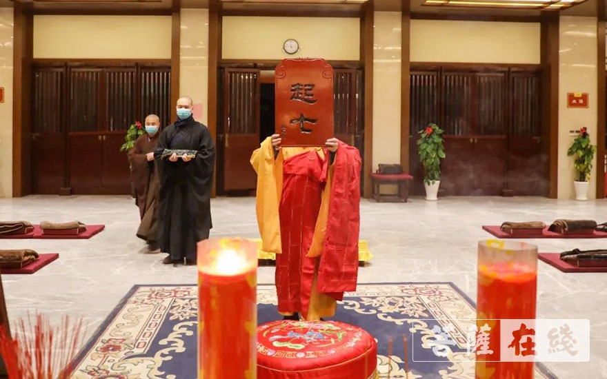 1月12日晚,在悠扬的梵音声中,寒山寺方丈秋爽大和尚拈香主法,举行熏坛仪式。大众齐诵大悲咒,遍洒甘露净水,惟愿以此净水荡尘涤垢,悉令坛场清净无染,与会众等福慧增长,所愿皆成。