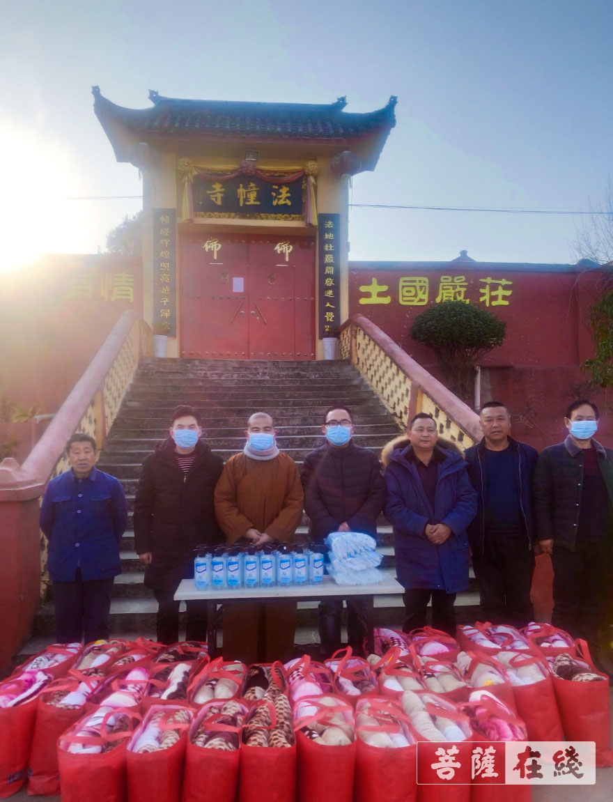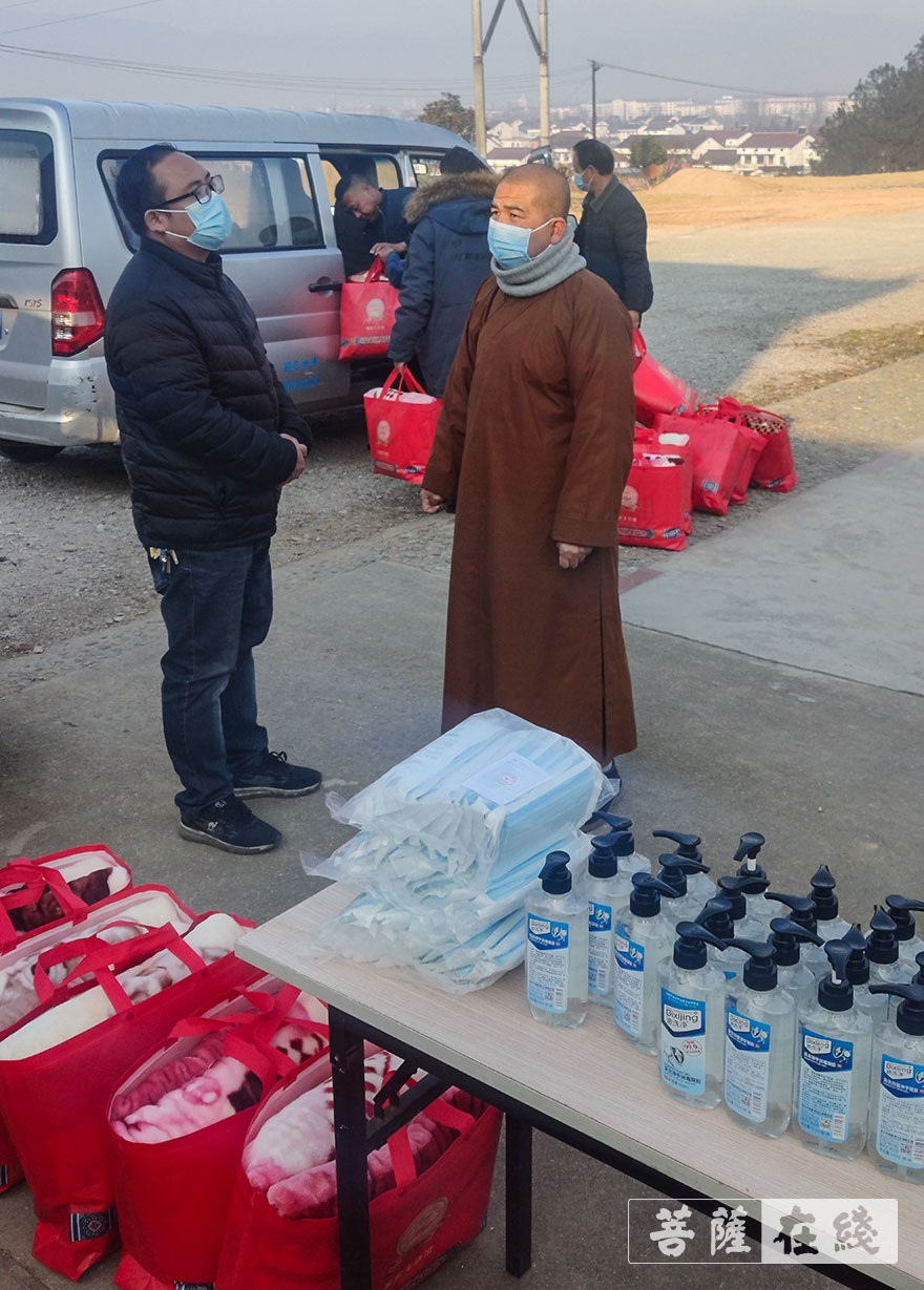 菩萨在线陕西讯 1月19日,因汉中法幢寺处于“双暂停”状态,暂不对外开放,新集镇政府副镇长徐超,工会主席马安刚及环卫工代表于法幢寺山门前,为一线环卫工人捐赠口罩,免洗液,毛毯等慰问物资,嘱咐环卫工人工作时一定注意个人安全,度过一个安全又温暖的新年。