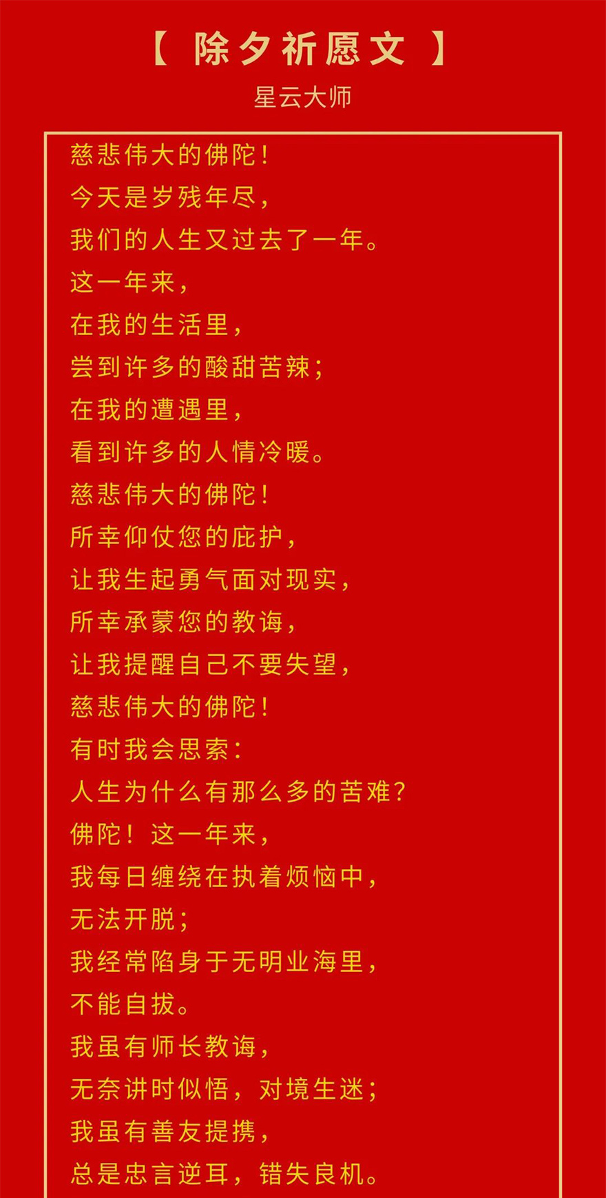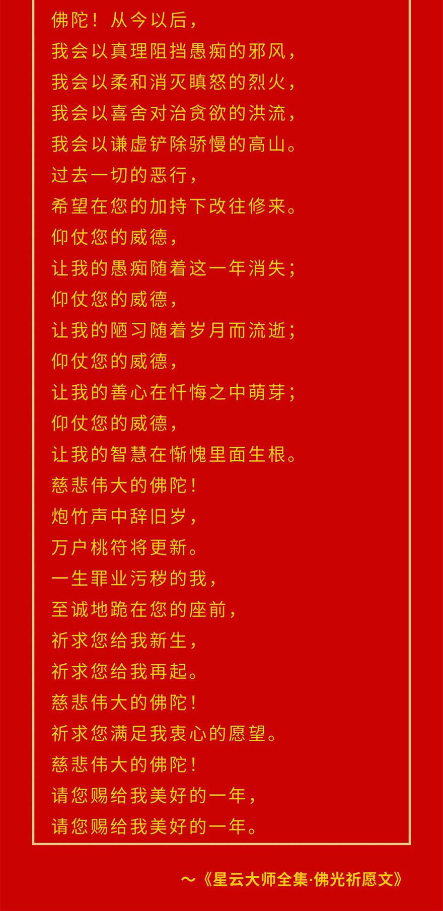 菩萨在线台湾讯 2月11日,农历腊月三十,在这辞旧迎新之际,星云大师发布除夕祈愿文,以下为全文内容: