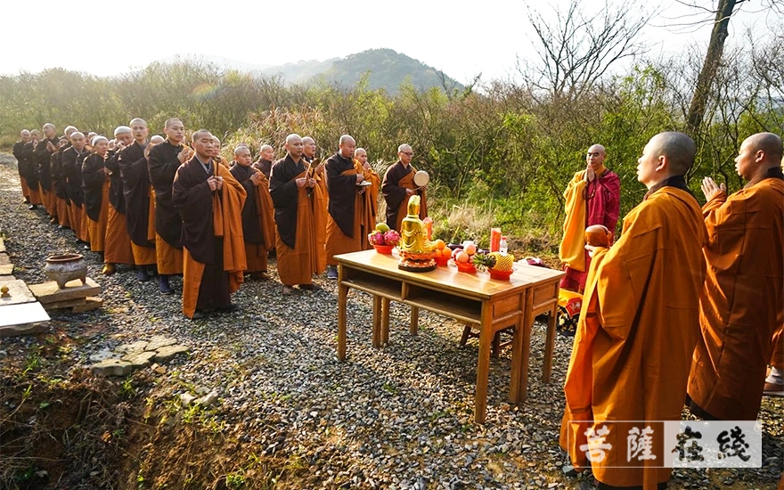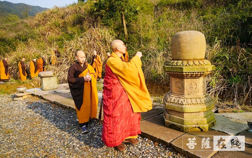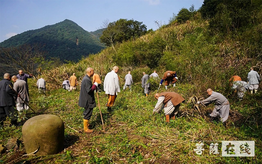 菩萨在线浙江讯 3月22日,宁波天童禅寺方丈诚信法师率众出坡,清理唐岙老普同塔院杂草。