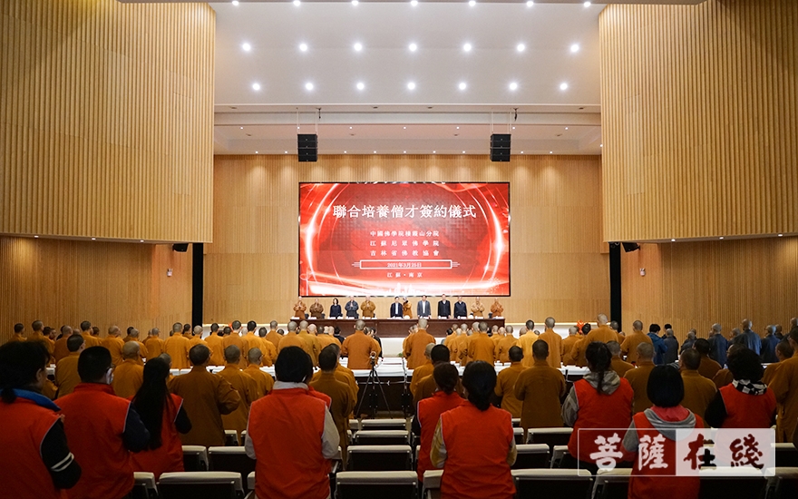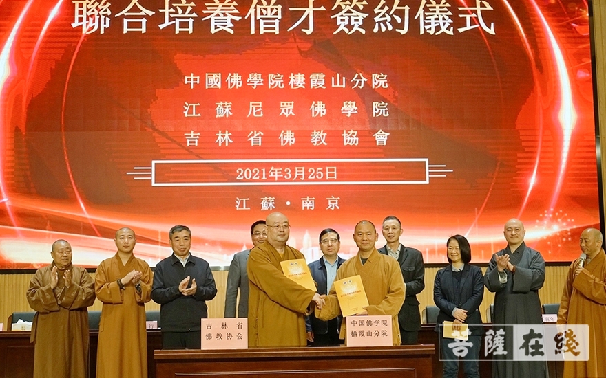 菩萨在线江苏讯 3月25日,吉林省佛教协会与中国佛学院栖霞山分院、江苏尼众佛学院达成联合办学共识并签署僧才培养战略合作协议。签约仪式由江苏省佛教协会秘书长、中国佛学院栖霞山分院副院长理海法师主持。