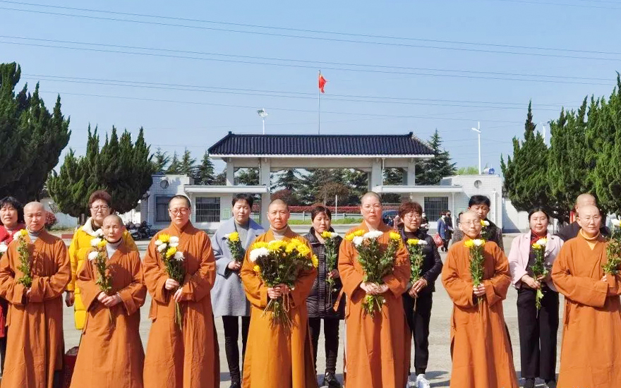 常文法师带领缁俗弟子手持鲜花前往烈士陵园祭扫