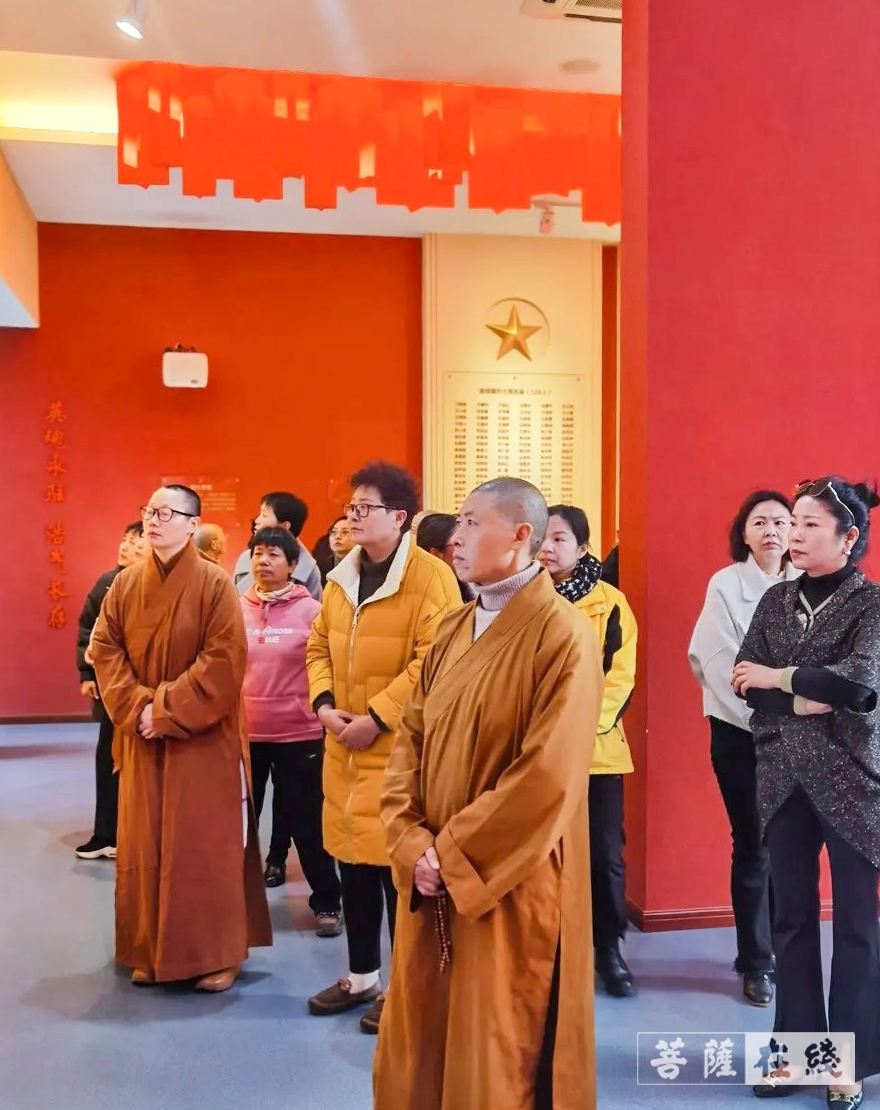 佛弟子倾听馆员对革命历史和先烈们的讲解
