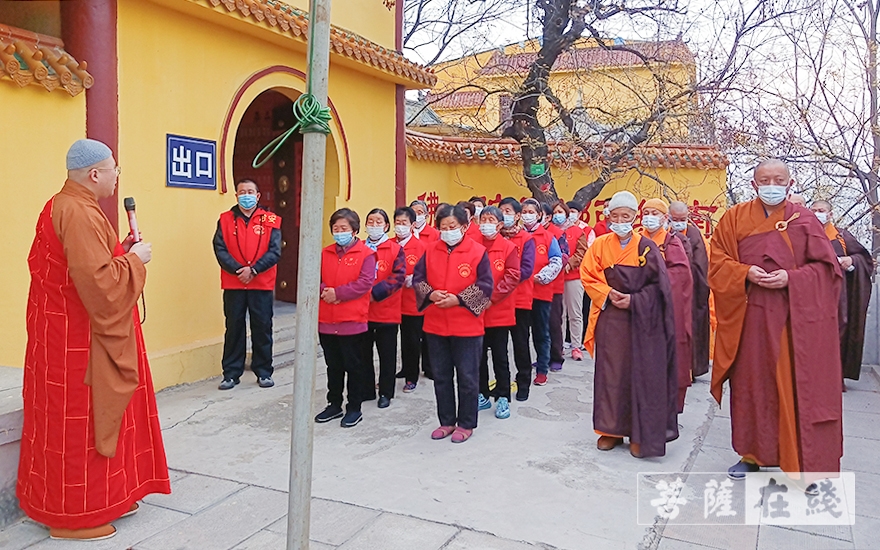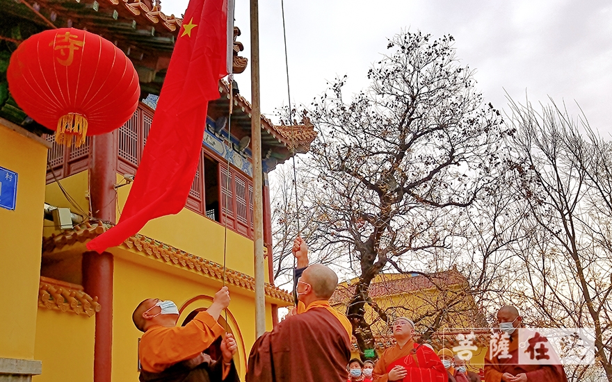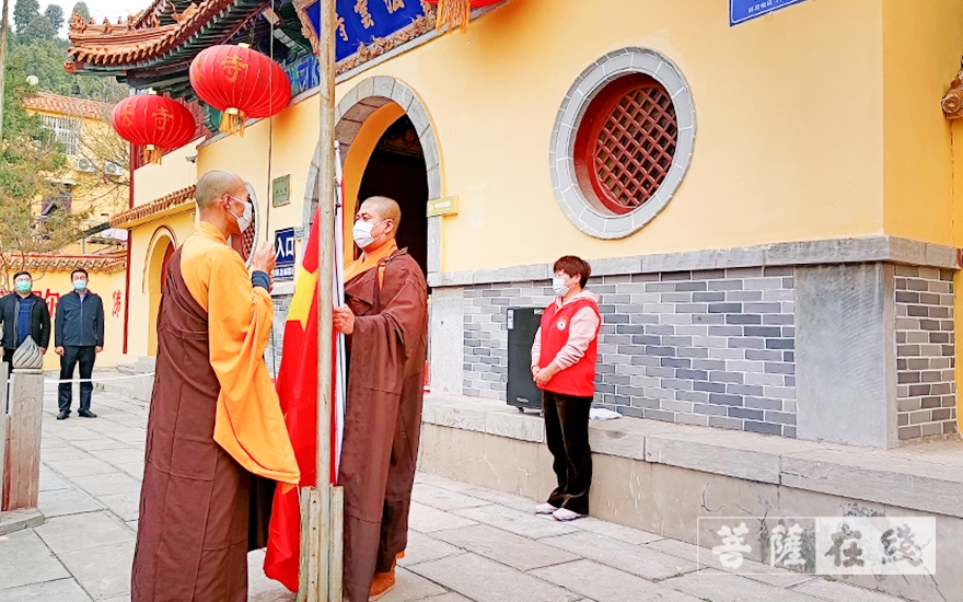 菩萨在线山东讯 3月26日,因疫情原因二次关闭山门的济宁市嘉祥法云寺重新恢复开放,常住法师们于山门前举行升国旗仪式。