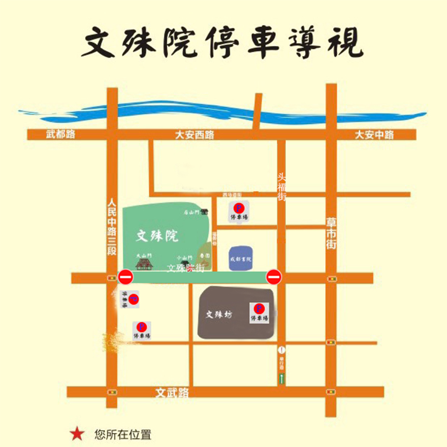 原经文殊院街、金马街、五岳宫街通行的车辆可通过百家塘街、楞伽庵街、通顺桥街、白云寺街、酱园公所街、金丝街、银丝街、头福街等道路绕行。前往寺院的信众及游客朋友们可至文殊坊地下停车场或周边其他停车场停放车辆,而后步行进入文殊院街。