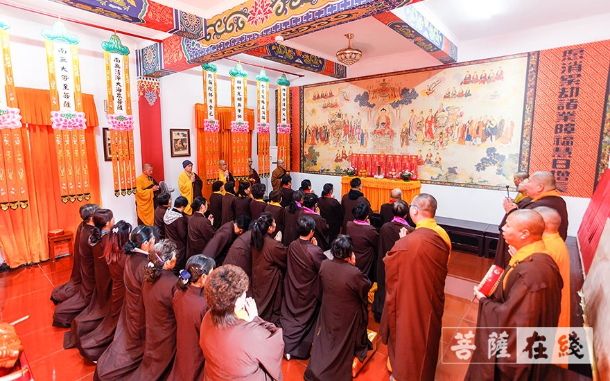 上午8时,受鼓山寺方丈智文法师委托,由鼓山寺监院界辉法师带领大众随文入观,按照皈依、断疑、忏悔、解冤、礼佛、报恩、回向等忏仪,藉由共修,提起大众虔诚忏悔的正念,并时时返观自照,让身心在忏悔中破除心碍。与会大众外慕诸圣,内重己灵,感应道交,共沾法喜。