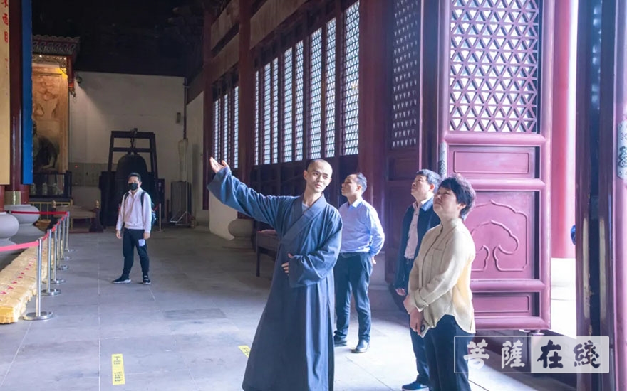 寒山学院副教务长同修法师等陪同考察团一行参观寒山学院办学场地重元寺,之后在重元寺法堂座谈交流。