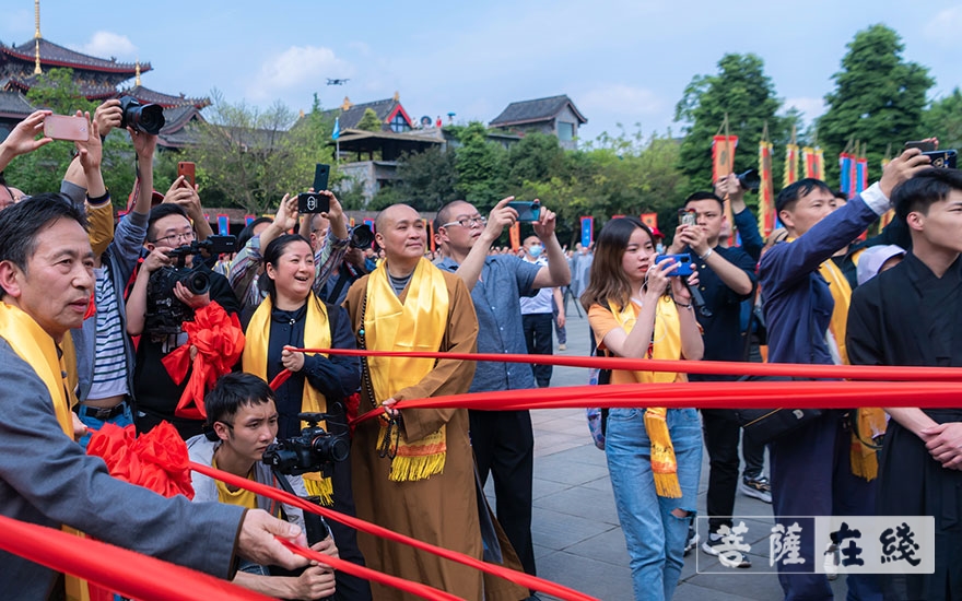 揭幕仪式上,峨眉武术几代传人有序列队,用“传递红绸”的形式表达着“衣钵相承”故事。龚德勤、永寿法师、肖家泽、向蕾、温佐惠为“峨眉派”照壁揭幕。