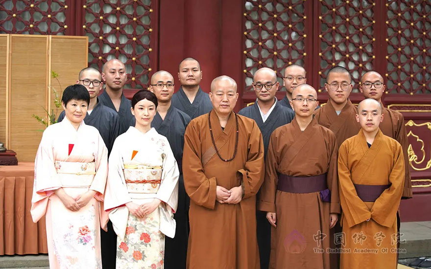 茶,由中国传入日本,起初由日僧最澄大师带回日本,其后由日本临济宗创始人荣西(1141—1215)禅师“入宋求法”时将茶种带到日本,并在日本大规模种植。至十六世纪,茶人千利休(1522—1591)创立了日本茶道。茶道提倡“和、敬、清、寂”,囊括了艺术、宗教、哲学等诸方面的要素,成为上自皇室贵族、下至普通百姓所喜闻乐见的日本传统文化的代表。“里千家”是日本茶道最大的流派之一。90年代,在中国佛学院第三任院长赵朴初居士和日本茶道“里千家”第十五代家元千玄室大宗匠的倡导下,“里千家”茶道纳入中国佛学院教学课程。1995年,中国佛学院建立了茶室并开设了日本茶道课,一直以来都由“里千家”指派的茶道老师授课。从2004年4月开始至今,中国佛学院如期举行一年一度的“丁香茶会”,并兼作学习茶道学僧们的汇报表演。