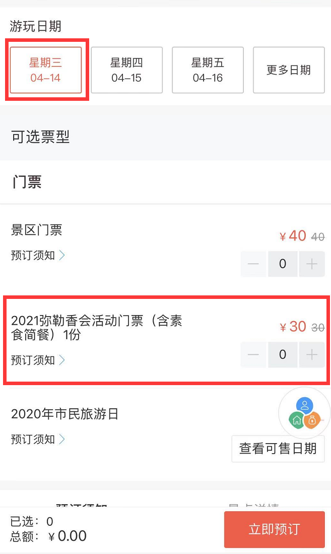 3.选后选择更多日期,选择“4月14日”,选择门票类型“2021弥勒香会活动门票(含素食简餐)1份”立刻预订即可预约成功。