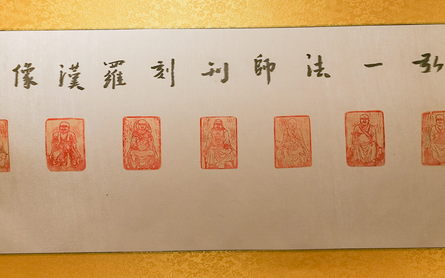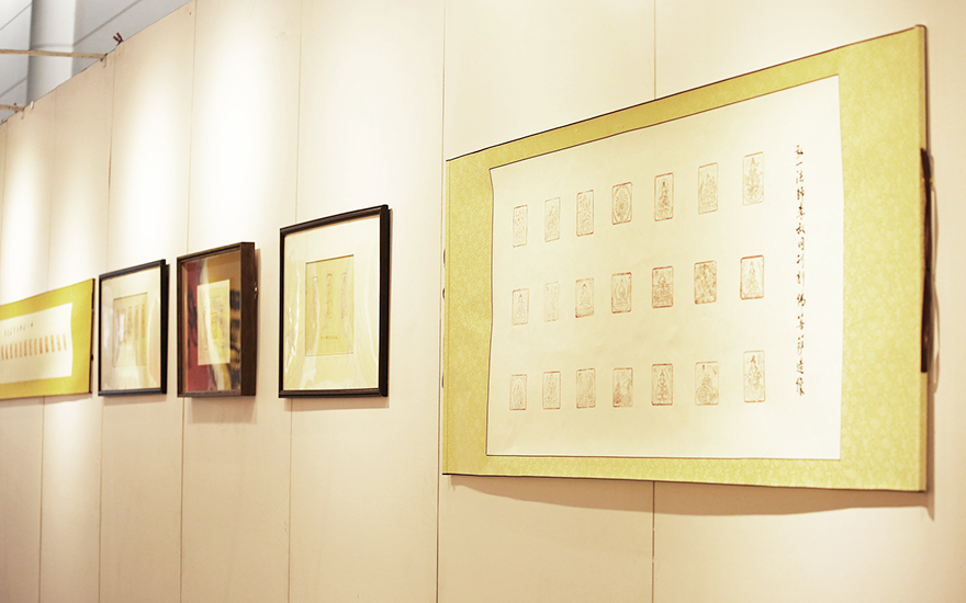 展会现场展出:百位高僧大德为庆祝澳门回归20周年题写墨宝“百福百佛”长卷(部分),一代宗师弘一法师李叔同的金石篆刻心经及佛菩萨像印章作品,爱国绘画国学大师夏荆山的佛像绘画作品,爱国绘画儒学大师江逸子的佛教绘画作品,仁悟法师工笔绢画佛像作品。