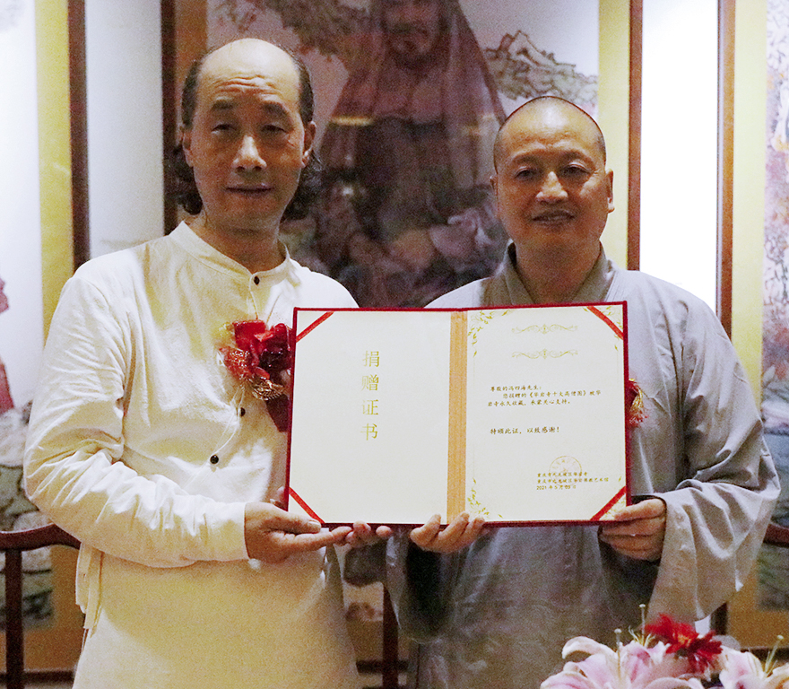 道坚法师为冯四海颁发捐赠证书