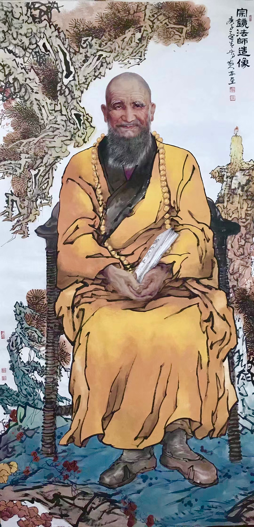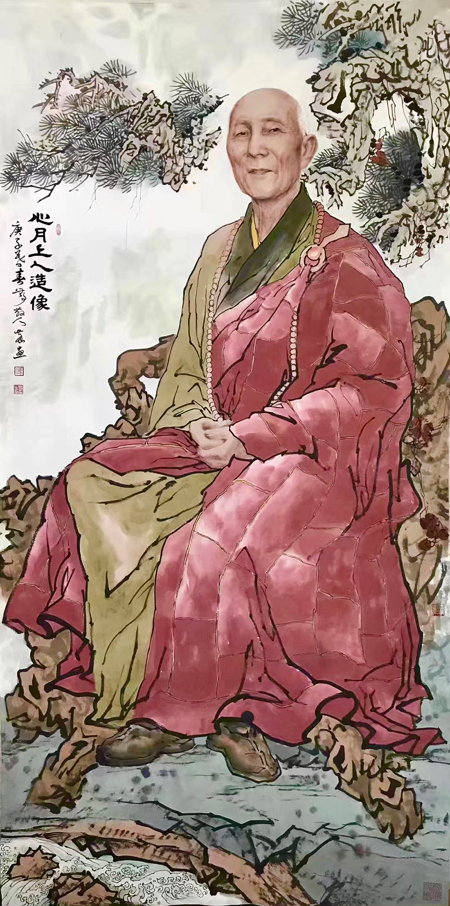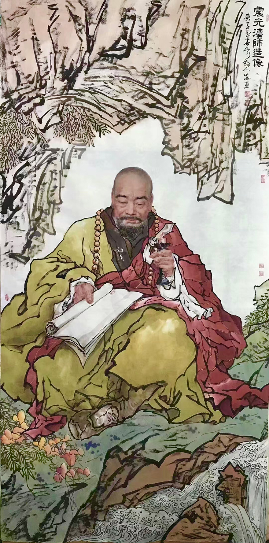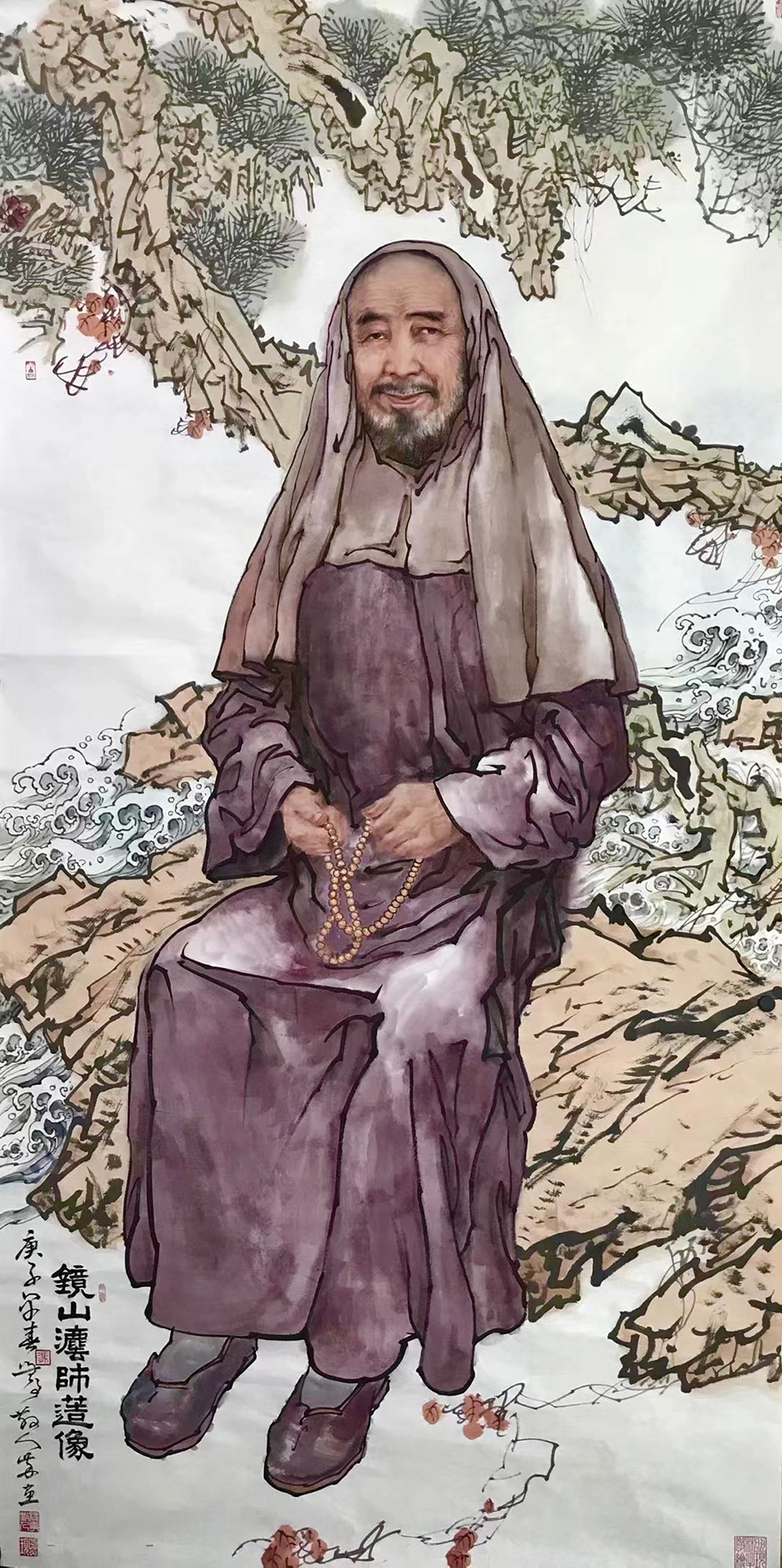 道坚法师表示,华岩寺自圣可开山,迄于今任华岩寺住持绵延三百余年。历代住持为一时之选,龙象辈出,代不乏人。他们或修建庙宇,或奉迎罗汉,或搬请藏经,或著书立说,或创办教学,或整理寺志,均竭力率全寺僧众为弘法利生作出重大贡献。通过西方绘画手法的面部特征作出的祖师形象,犹如祖师亲临。冯四海用深厚的笔墨功底,将半写半艺的绘画手法运用得活灵活现。(文图/重庆华岩寺)