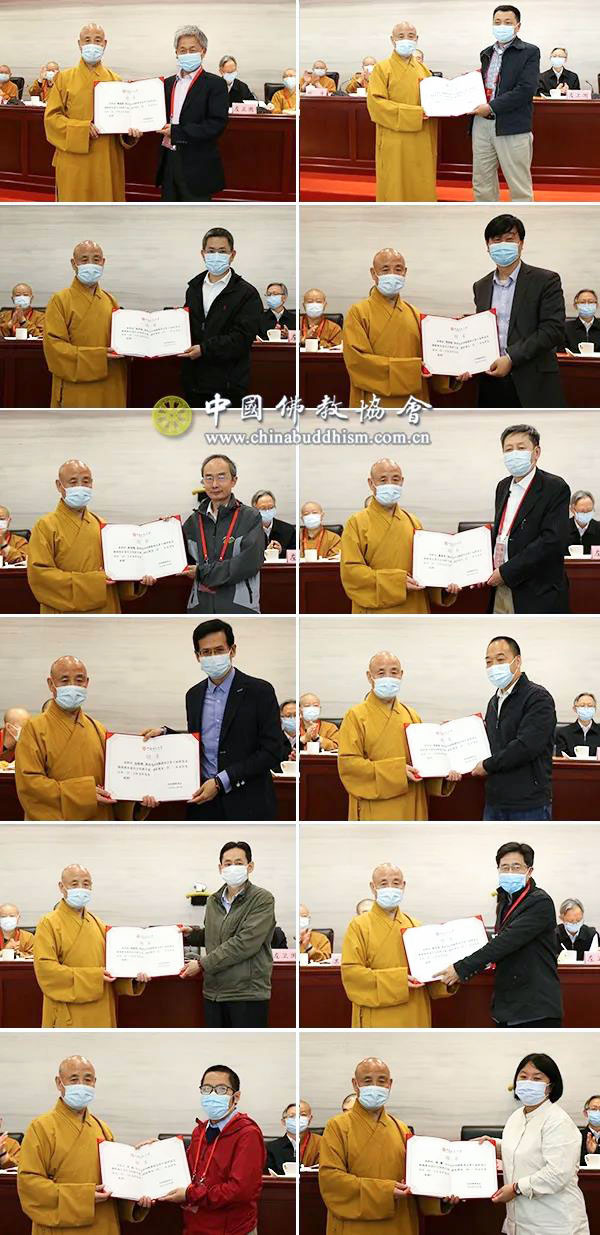 本届理事会佛教教育委员会还聘请了魏道儒、张风雷、何建明、张文良、李四龙、周学农、徐文明、刘成有、黄夏年、纪华传、包胜勇、刘鹿鸣、喻静、明尧等14位国内知名专家学者担任相关工作小组的成员。演觉法师向专家学者颁发了聘书。