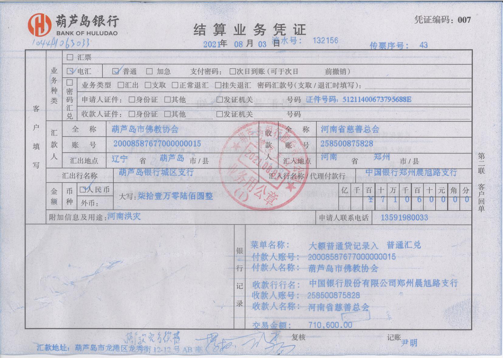 截止到8月3日上午,葫芦岛市佛教界共收到全市各寺院及四众弟子捐助赈灾款71万余元。款项已汇入河南省慈善总会定向用于“防汛抗洪 驰援河南”慈善项目。(文图/葫芦岛市佛教协会)
