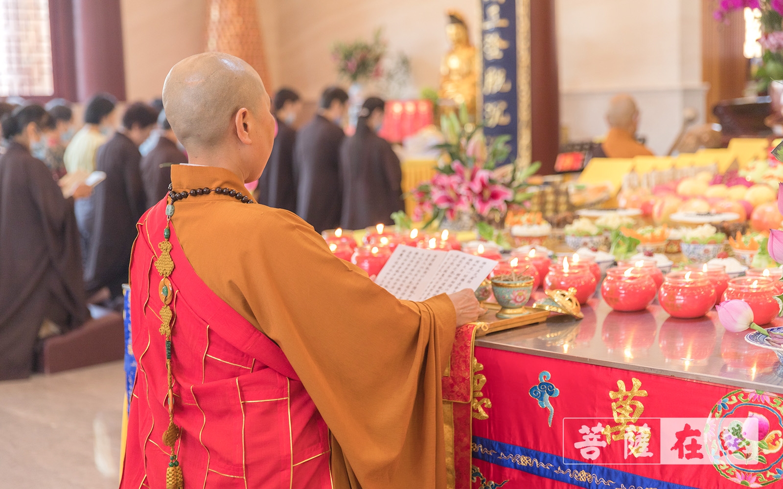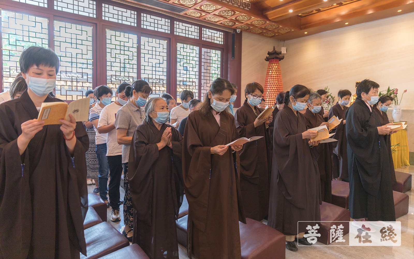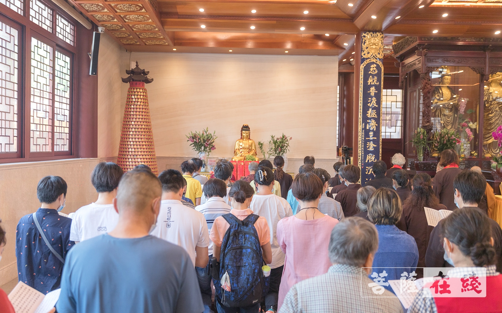 菩萨在线上海讯 8月22日(农历七月十五),上海龙音寺举行孝亲报恩盂兰盆法会。在龙音寺住持信弘法师的带领下,四众弟子恭诵《盂兰盆经》,并设盂兰盆供。