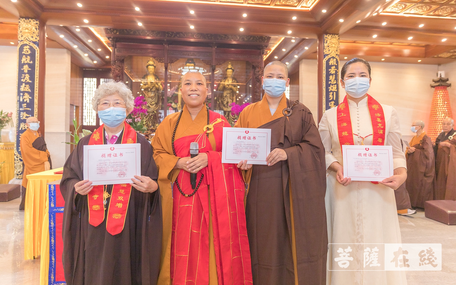 法会开始前,信弘法师为护法居士颁发捐赠证书(图片来源:菩萨在线 摄影:妙清)