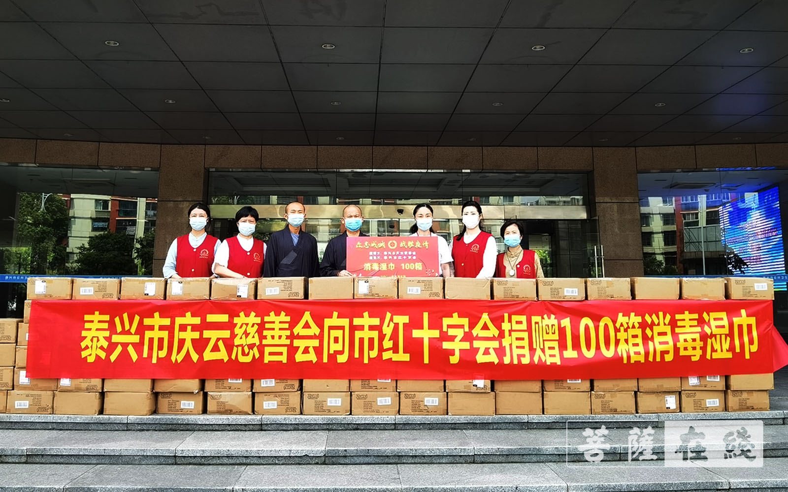 菩萨在线江苏讯 8月9日,泰兴市庆云慈善会向市红十字会捐赠100箱消毒湿巾,为一线防控人员提供安全保障。