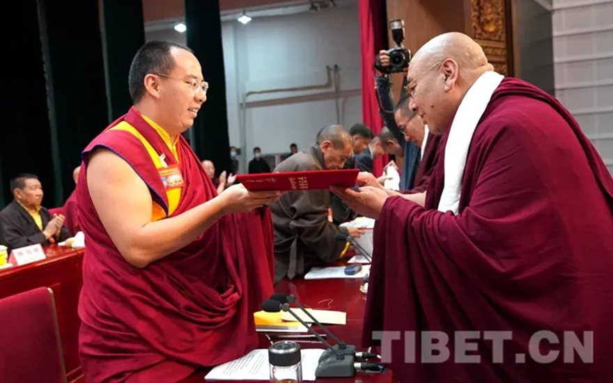 会上,十三届全国政协常委,西藏自治区政协副主席,中国佛协副会长、西藏分会常务副会长,西藏佛学院院长珠康·土登克珠宣读《表彰决议》。(文图/中国西藏网)