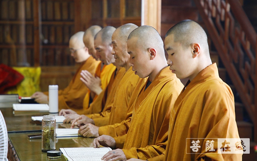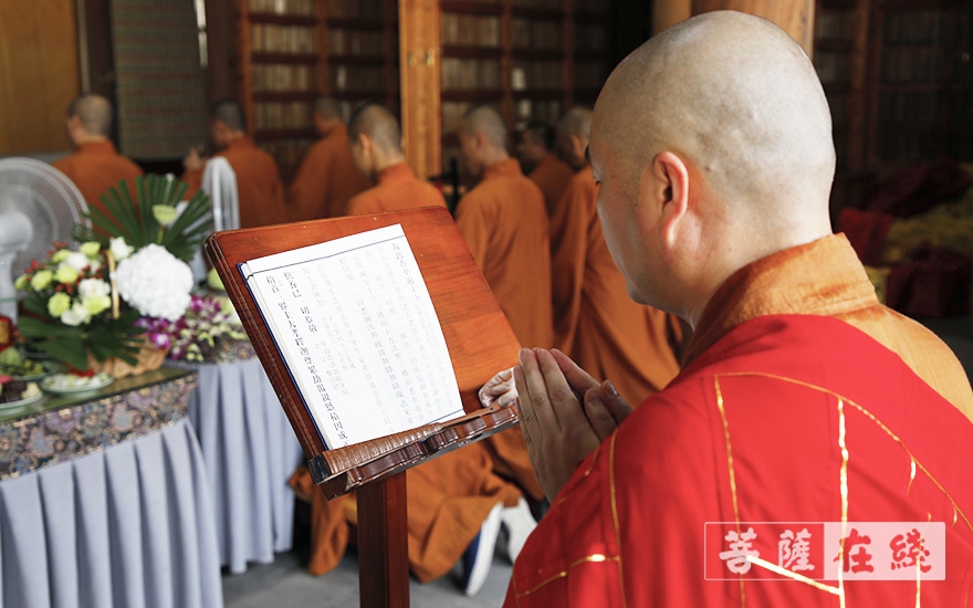 上午8时,灵峰讲寺钟鼓长鸣,梵音呗唱。大众法师在三圣殿虔敬讽诵《佛说盂兰盆经》。