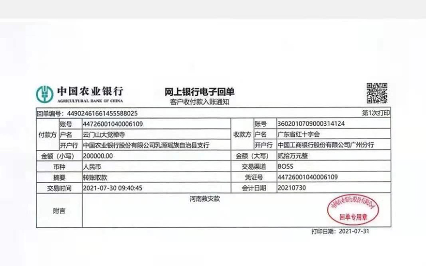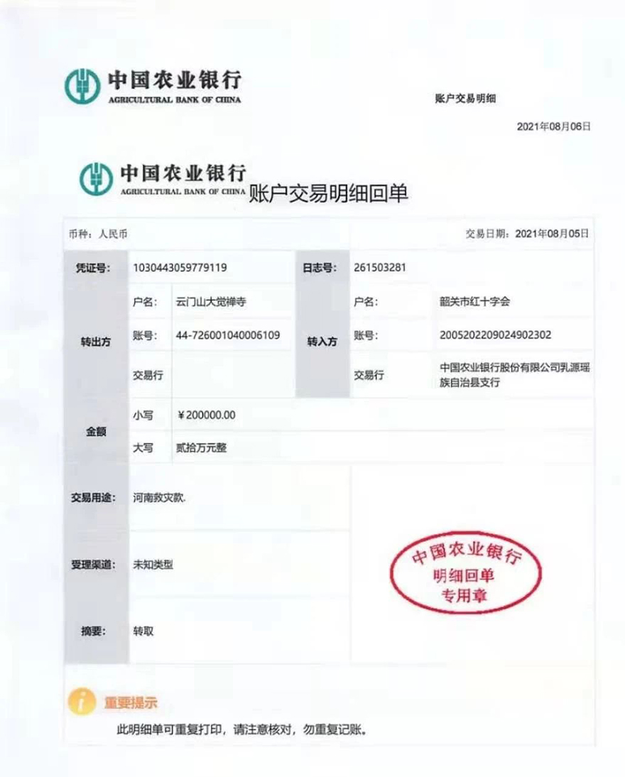 为了帮助灾区群众度过危机,韶关云门寺及十方善信秉着庄严国土、利乐有情、慈悲济世、爱国爱教的优良传统,于7月30号向广东省红十字会捐赠20万善款;8月5号再向韶关市红十字会捐赠20万善款,总计四十万元善款。通过广东省、韶关市红十字会将善款捐往灾区。(文图/云门祖庭)