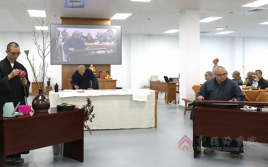 2019级研究生闻定法师、2020级研究生耀辉法师、2021级本科生道荣法师表演琴道、花道、书道