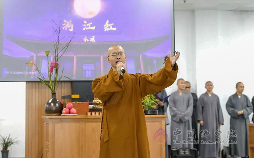 在佛教典籍中,月亮或代表清凉,或代表圆满,或代表心地。在这个月圆的日子里,学僧们呈现了一场丰富多彩、别开生面的表演。有传统梵呗的唱诵,有新潮生动的脱口秀;有古典的雅乐,有现代的管弦;有极具感染的朗诵,有刚猛有力的武术。新时代,新校区,新学期,新愿景。在这场中秋茶话会的表演中,展现了新时代僧青年的智慧与才华,担当与奉献。