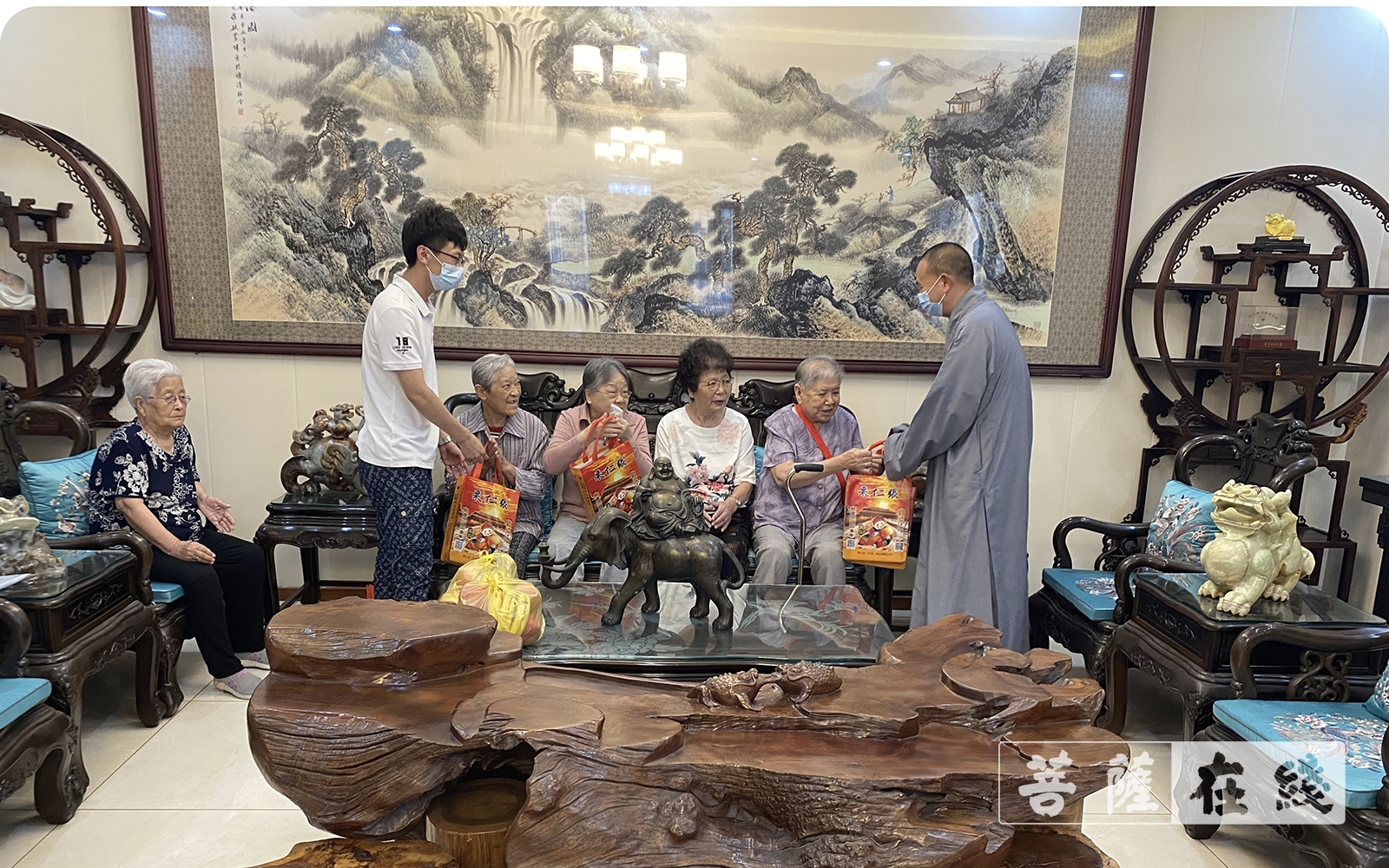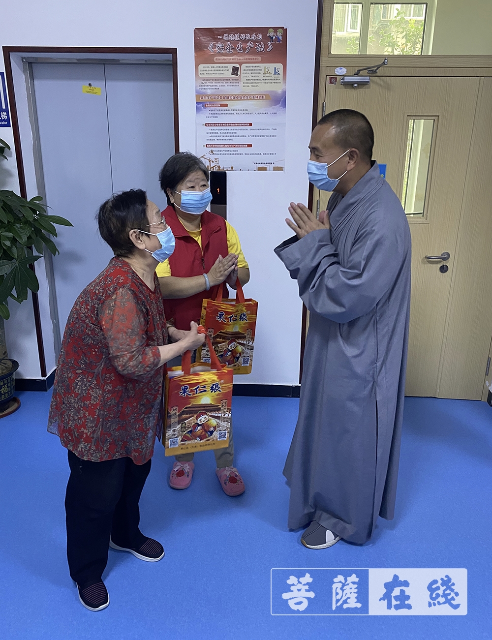 菩萨在线天津讯 9月18日,天津大悲禅院悟通法师与天津市河北区慈善协会副会长李研,一起看望居住在养老院的困难群众。为他们送去月饼、水果等物资,在中秋佳节到来之际,传递温暖,为他们送去祝福。(文图/天津大悲禅院)