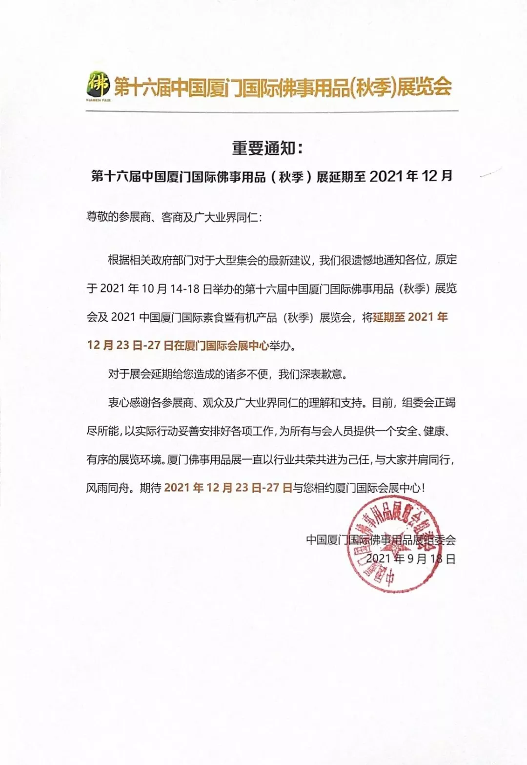 菩萨在线福建讯 根据厦门相关政府部门对于大型集会的最新建议,第十六届中国厦门国际佛事用品(秋季)展览会 及 2021中国厦门国际素食暨有机产品(秋季)展览会,将延期至 2021年12月23-27日 在厦门国际会展中心举办。