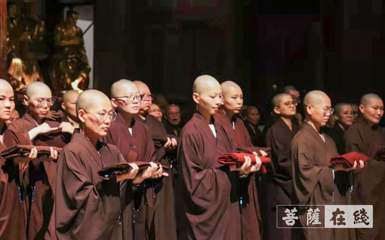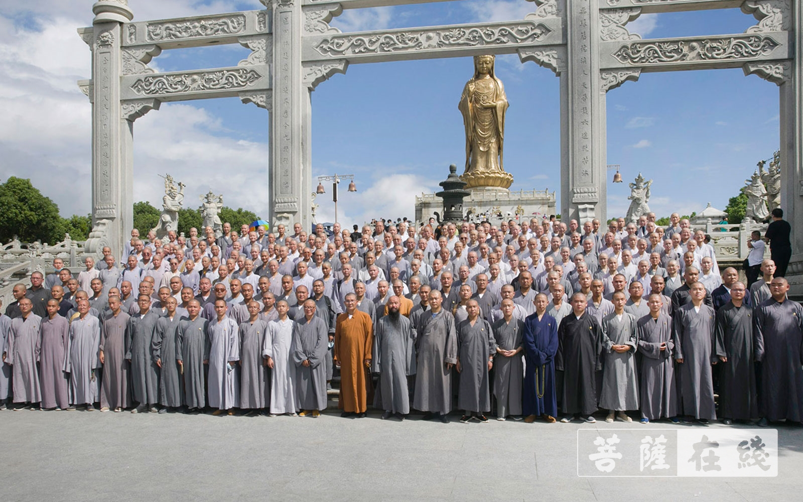 9月11日,2021级男众、女众部新学僧朝礼普陀山。在南海普陀观音铜像前,新学僧称念大悲观世音菩萨圣号,并以右绕三匝之礼表达对观音菩萨之礼敬。