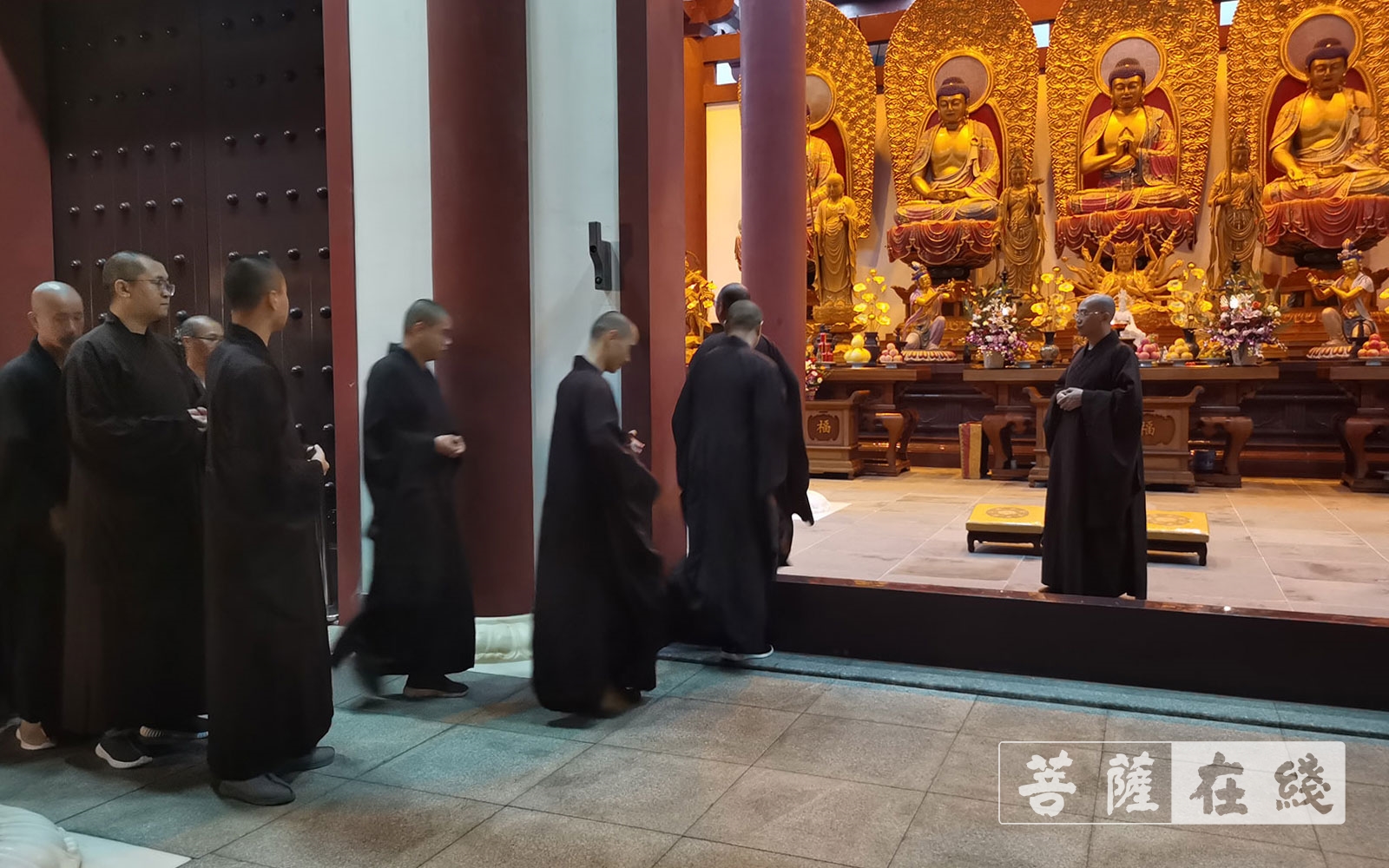 9月7日晚,照慧法师、显博法分别带领男、女众新学僧学习殿堂威仪。
