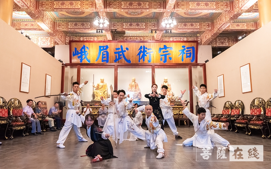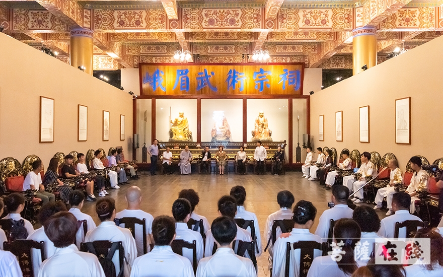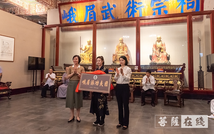 菩萨在线四川讯 9月14日,峨眉派功夫团成立暨揭牌仪式在大佛禅院举行,峨眉山市委常委、宣传部长卞茜,峨眉山市副市长罗瑜,峨眉山文体旅局局长苏真武,峨眉武术联合总会会长满霖法师,著名导演罗可歌,峨眉山市武术运动中心主任王超以及四川省武术界人士及武术爱好者参加活动。峨眉派功夫团,是为坚定文化自信,弘扬中华优秀传统文化,更好地推广、宣传峨眉武术,助力巴蜀地区文旅事业的发展,经峨眉山市文化体育和旅游局批准,以峨眉山市武术协会为主体、联合四川省内峨眉武术界人士而发起设立。