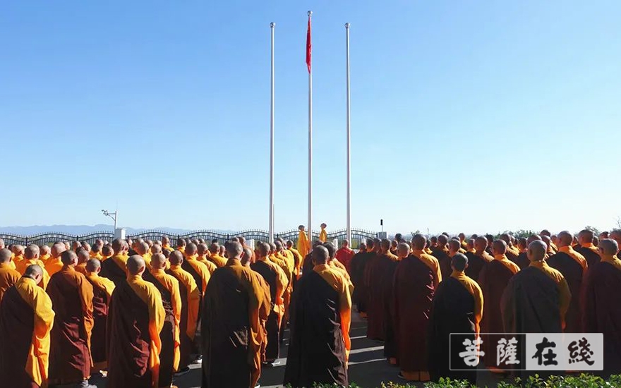 菩萨在线北京讯 10月11日,中国佛学院在凤凰岭新校区举行升国旗暨洒净仪式。洒净仪式开始前,全体人员举行升国旗仪式。