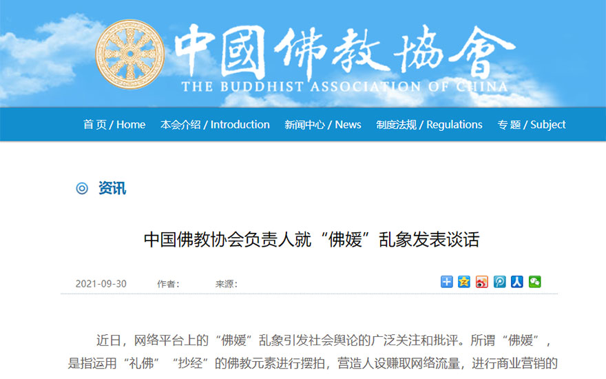 中国佛教协会对“佛媛”的行为表示坚决反对,对社会媒体对“佛媛”乱象的批评表示赞同,对有关平台依法依规处理涉“佛媛”账号表示欢迎和支持。