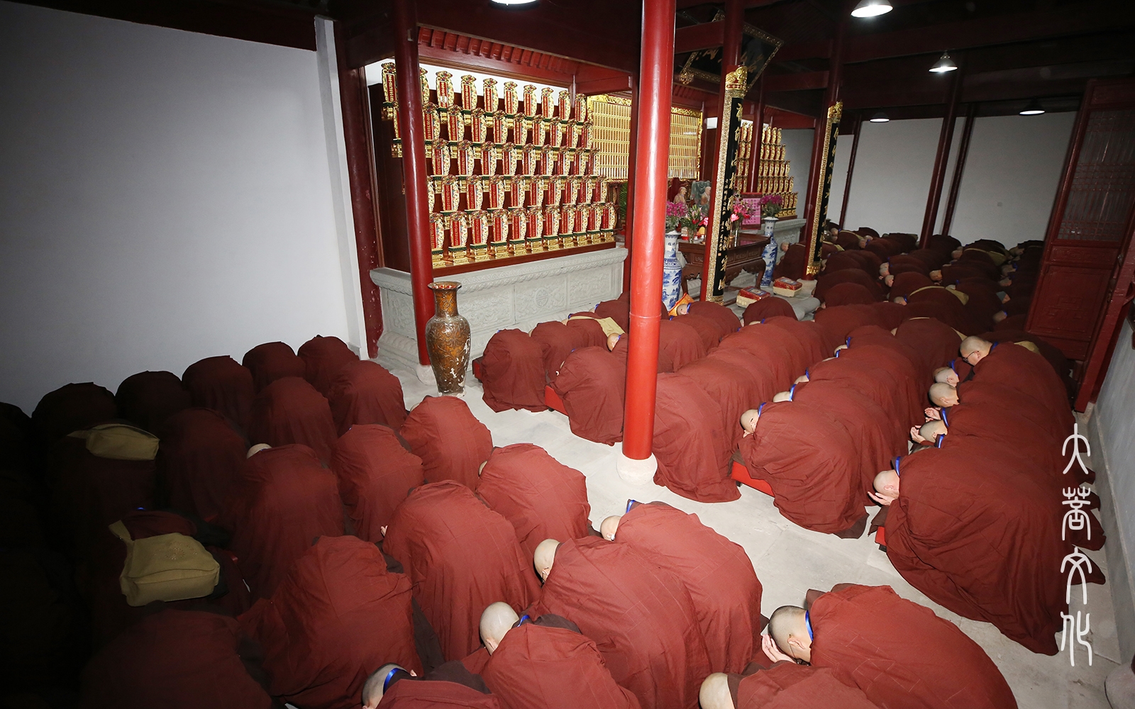 新戒比丘下坛后,分班集结,在引礼师父的带领下礼四圣(韦驮菩萨、伽蓝菩萨、监斋菩萨、祖师菩萨)。