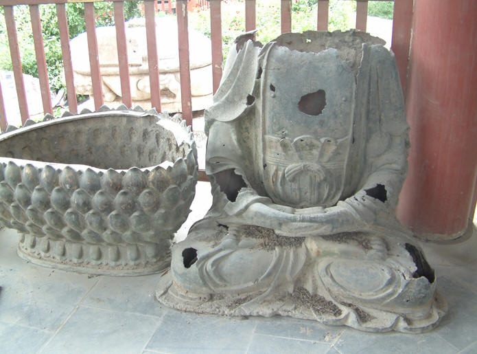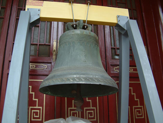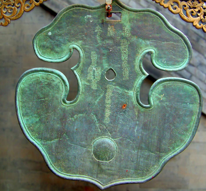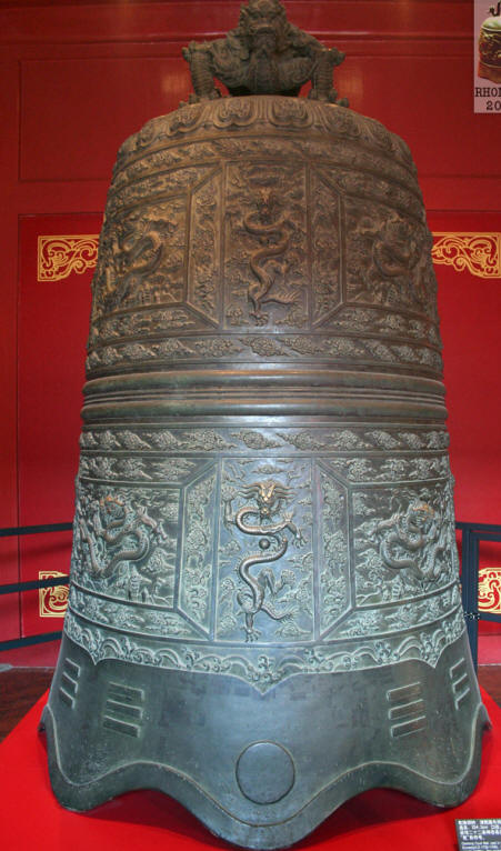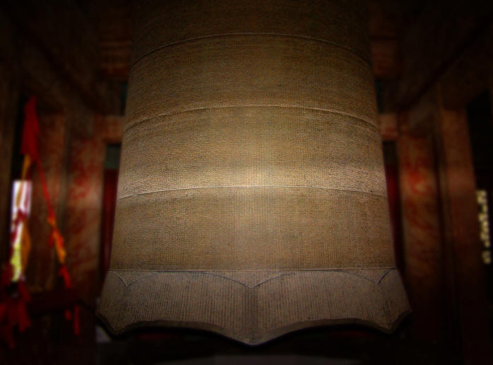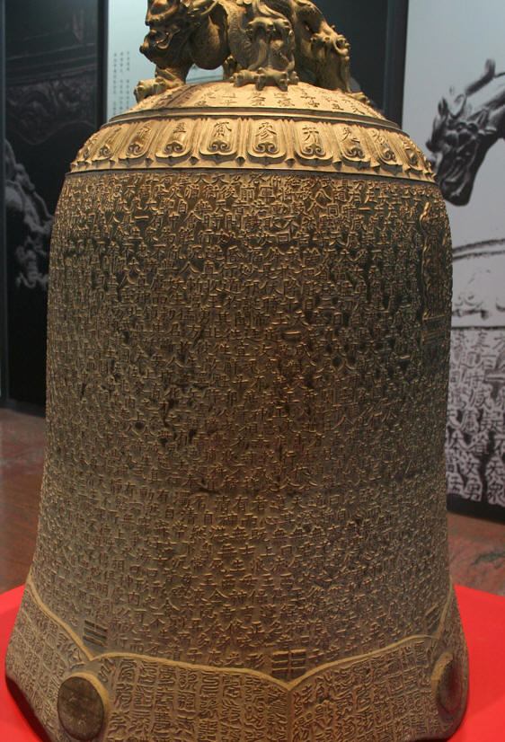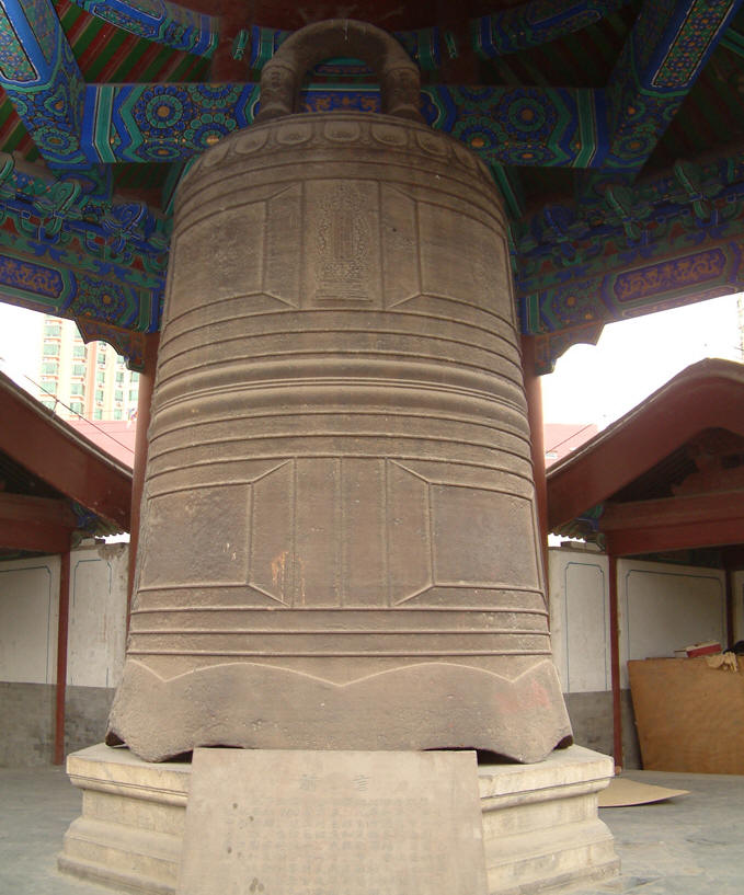 大钟在寺的后院钟楼上。楼高16.7米,上圆下方,四面有窗,铜钟相传为明代永乐年间姚广孝所铸,是600年前的古物。钟高6.94米,最大直径为4米,深0.7米,总重量为46.5吨,被誉为"中国钟王",钟声洪亮数里可闻,钟体内外铸有《华严经》全部80卷文字共23万之多,全用楷书书写,故又名"华严钟"。