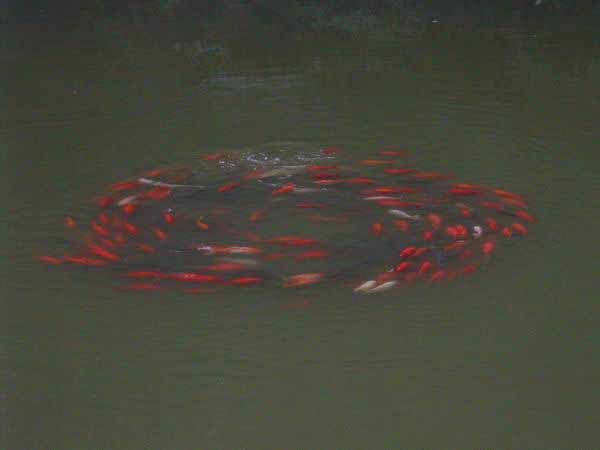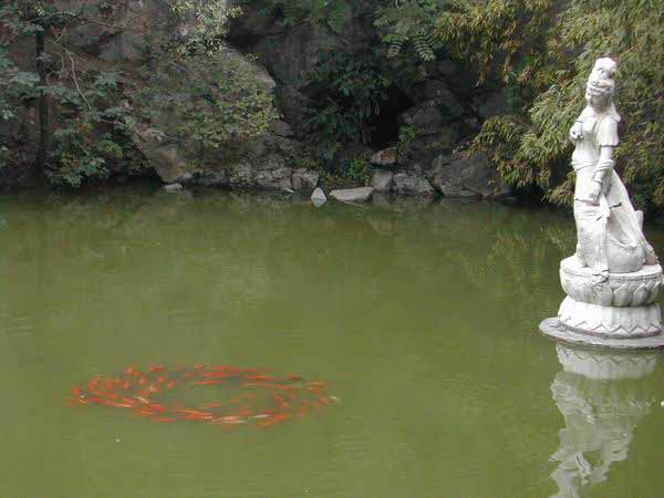 寺里现存古迹,是殿后峭壁下的大金鱼池。池中的大金鱼,长得奇特,最大的有二尺多长,金红、墨菊色的最多,还有银灰、彩斑等各种颜色的,有几尾天蓝色金鱼,聚群浮游,也面像一匹织绵。游人伫立池岸,倒影入湖,金鱼很快结群游来,不断吐泡,若游人投以鱼饵,它们衔食以後,活跃得抬头称谢。据说,这些金鱼是在1851年以前放养的,在这里繁殖已有一百三十多年。据说金鱼池始建开乾隆十六年(1751年),咸丰年间扩建并放养金鱼。据说,当年慈禧在水心亭观鱼,见一大如婴儿的金鱼,慈禧封其为头领,并唤随侍太监潜水捉来,将自己的金耳环赐给金鱼,佩於腮上。