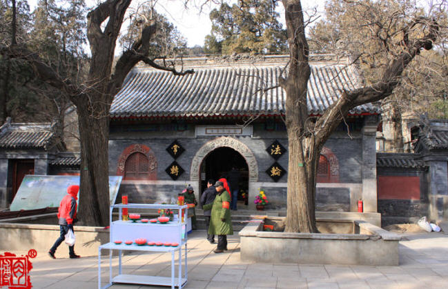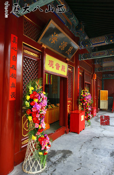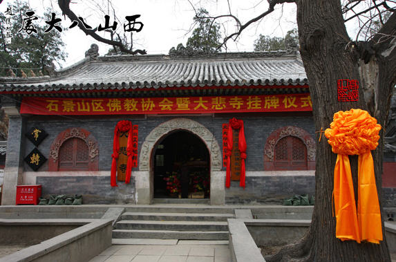 大悲寺位于北京市西山余脉平坡山半腰,三山庵西北一里的密林深处,从三山庵上去,山道两旁有许多奇形怪状的石头。寺宇朝南,入门翠竹满院(竹名“黄皮刚生”,为稀有品种。),拾级而上,中有香草和假山盆景,大殿匾额为“悲源海”。前殿丛生的翠竹,茎节匀称,枝叶秀丽。一般丛竹,每逢深秋,势必凋零。这里的丛竹,却独具特色,即便是雪絮冰封,依然青翠欲滴,为八大处稀有景致。寺就建在平坡山的半腰上。