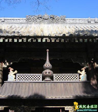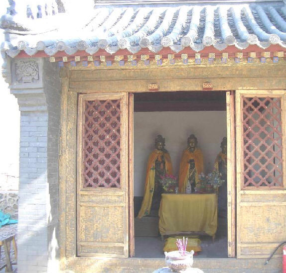 大悲殿三楹,正中供金漆木雕观音像,两旁有碧霞元君等八尊塑像。