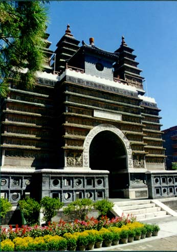 五塔寺位于呼和浩特市旧城东南部,原名金刚座舍利宝塔,因塔座上有五座方形舍利塔,故名为五塔寺。塔始建于清雍正年间,高约16米,塔身均以琉璃砖砌成,塔身下层是用三种文字刻写的金刚经经文,上层则为数以千计的鎏金小佛,刻工精巧,玲珑秀丽。