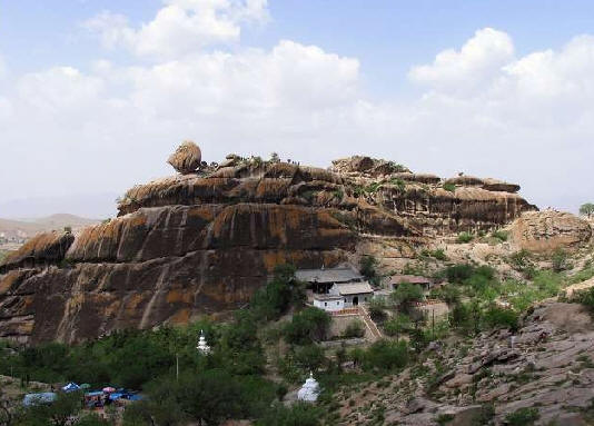 桃石,算是最引人注目的奇景,传说是仙人一口气吹成的,桃石约有十个蒙古包大小,形如心脏,以尖尖底端与峰顶岩石相连接,好似生长出来一颗鲜桃。朝圣的人们来到这里也需转它几遭。它的西沿距崖边只有咫尺,不小心则有坠入崖底之险。