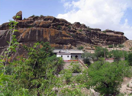 “真寂寺”附近风光奇秀,桃石山从沟谷骤然拔起,桃石以三点支撑在山顶崖端,风吹犹动,雨打欲摇,大有轰然坠落之感。早年古木苍郁,高山隐寺,极为幽邃。