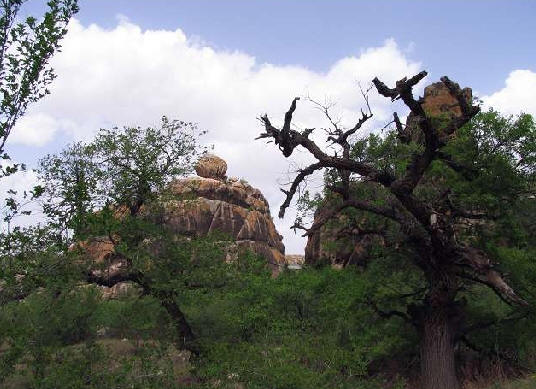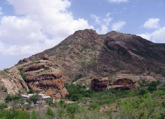 桃石山山峰,也叫钦达慕尼峰,爬上这座山峰,须经“阎王道”。阎王道东北角落里有一大卧牛石,面向东方,形似乌龟,人称“金龟”,金龟下有一空洞,人称“金龟穿洞”。