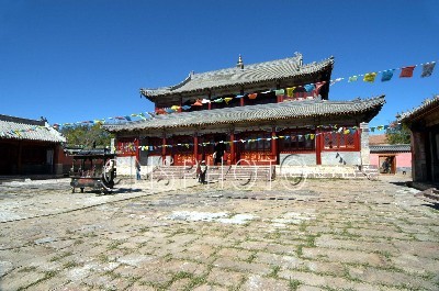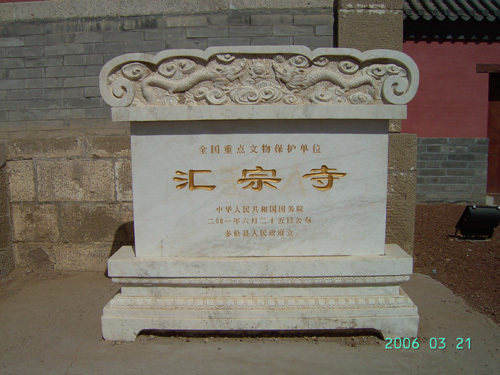 汇宗寺,亦作彖宗寺,内蒙古地区喇嘛教格鲁派黄教 寺庙,在锡林郭勒草原多伦县城关镇内,当地俗称“东大仓”。清康熙三十年公元1691年 ,清朝皇帝康熙在多伦淖尔今多伦附近 会见内外蒙古各部、旗王公、台吉,史称“多伦会盟”,并应蒙古封建王公所请,答应“愿建寺以彰盛典”,开始修建寺院,翌年开始修建。汇宗寺庙质为木架结构,殿高15米,座落在条石基础上,殿体前为包厦。殿分上下两层,由1米粗的20根大梁木支撑着,为九九八十一间之尊数,整体造型相当精致美观。殿顶是蓝色琉璃瓦滚龙脊造型,塑有可与黄金相比的1.5吨金黄色风磨铜庙顶一个,八卦图一个,羚羊两只。在主殿院落内有5层殿院,南北长达一里半左右,东西宽约百米。于康熙五十一年公元1712年 三月全部竣工。康熙五十二年公元1713年 赐寺名为“汇宗寺”,康熙亲题匾额,御书汇宗寺碑文和汉白玉碑一对。用蒙、汉、满、藏四种文字记述建寺缘起经历。汇宗寺有跳舞场佛事跳鬼 、大山门、天王殿、钟鼓楼正大殿上下两层 、东西配殿、官仓、佳仓、后殿等,巍然耸立,金碧辉煌。汇宗寺由章嘉呼图克图即章嘉活佛 为该寺住持,为政教合一为主的寺庙,执掌漠南内蒙古地区宗教事务,供管蒙旗政务。各旗均派一名喇嘛高僧来此寺庙,成为口外最大的喇嘛教寺庙,庙内常驻喇嘛1000余名,每名喇嘛年饷银50两,由租银地及各旗县供给。此外距汇宗寺方圆周围30公里的土地、出产均划归此寺。汇宗寺与19年后建起的善因寺相仿,但占地规模,庙宇建造范围,比善因寺约大两倍。现仅存部分建筑。