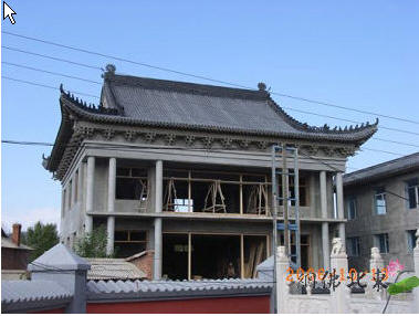 共修建配有东西廊房的三层殿(每殿三间),前殿横匾是“佛慈广大”;中殿是“大雄宝殿”;后殿无匾。三层殿前都有台阶。殿顶是高楞大背的两侧伸出环眼阔口的龙头;坡苫长,前出廊檐后出梢;长坡弯弯,卷翘檐,瓦缝参差,垄绞齐正。廊檐里面是两棵红艳艳明柱,和明柱对齐的从东到西悬空排列着二龙戏珠、飞禽展翅、走兽跳跃。雕刻艺术,如同活的一般。