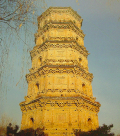 北塔是辽代砖砌舍利塔,又称“罗汉塔”,始建于辽代天庆年间(1111~1120年),高30多米,塔身集楼阁式、覆钵式和金刚宝座三种形式为一体,造型极为特殊。塔的下部为八角形须弥座,上面建楼阁式砖塔两层,再上置覆钵和“十三天”塔刹。这种造型的辽塔,十分少见。