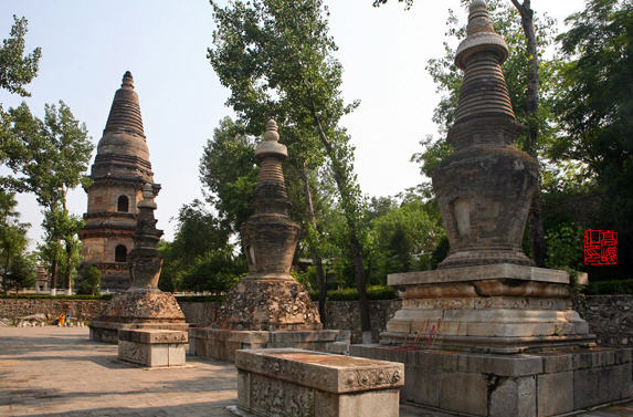 四座唐塔都有明确的纪年,塔的平面呈正方形,七层,分单檐和密檐式两种,而造型大致相同。塔身上雕刻着各种佛像,其中唐开元十五年(727年)所建的石塔,内壁雕刻有一个供养人,此人深目高鼻,推断应为外国人形象,这与当时唐代与中西亚交流广泛、大量任用外族为官有直接关系。雕刻的服饰十分华丽,线条细腻流畅,反映了盛唐中外文化交流的繁盛景象。